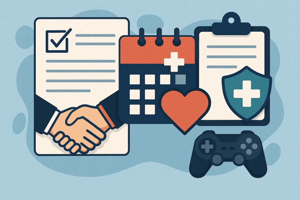 • Deliverables: pre-participation medicals, ergonomics setup, micro-break policy, anti-harassment reporting, return-to-play rules, travel safety.